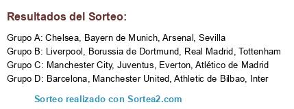 Lista de participantes: Chelsea, Juventus, Inter, Sevilla, Manchester United, Manchester City, Atlético de Madrid, Borussia de Dortmund, Tottenham, Bayern de Munich, Real Madrid, Arsenal, Everton, Athletic de Bilbao, Liverpool, Barcelona.