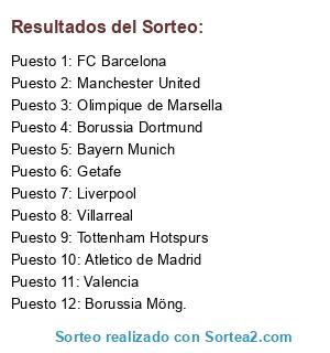 Lista de participantes: Atletico de Madrid, Villarreal, Borussia Dortmund, Getafe, FC Barcelona, Valencia, Olimpique de Marsella, Bayern Munich, Manchester United, Liverpool, Borussia Möng., Tottenham Hotspurs.