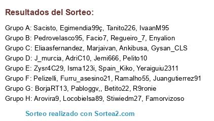Lista de participantes: Juangutierrez91, Isma123i, Enyalion, Sacisto, Yeraiguiu2311, Pabloggv,, IvaanM95, Facio7, Ramalho55, J_murcia, Stiwiedm27, Eliaasfernandez, Gysan_CLS, Pelito10, R9ronie, Furru_asesino21, Arovira9, Pedrovelasco95, Locobielsa89, Betito22, Pelizelli, Egimendia99ç, Tanito226, AdriC10, BorjaRT13, Regueiro_7, Spain_Kiko, Marjaivan, Famorvizoso, Jemi666, Zysr4C29, Ankibusa.