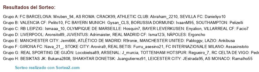 Lista de participantes: ATHLETIC CLUB: Abraham_2210, JUVENTUS: Adrimaister, RC CELTA DE VIGO: Pedrovelasco95, VALENCIA CF: Pelito10, OLYMPIQUE DE MARSEILLE: Hosquin7, BESIKTAS JK: Bukana2808, NÁPOLES: Ergoncho, MANCHESTER UNITED: Pabloggv, VILLARREAL CF: Facio7, FC INTERNAZIONALE MILANO: Assasinstoto, ATLÉTICO DE MADRID: R9ronie, SOUTHAMPTON: Pelizelli, REAL BETIS: Furru_asesino21, SHAKHTAR DONETSK: Juangutierrez91, AS MONACO: Ramalho55, RB LEIPZIG: Ismaaa_10, LIVERPOOL: Aronsito89, REAL SPORTING DE GIJÓN: Locobielsa89, MANCHESTER CITY: Jemi666, BAYER LEVERKUSEN: Enyalion, REAL MADRID CF: Isma123i, BORUSSIA DORMUND: IvaanM95, SEVILLA FC: Danieliyo10, FC BAYERN MUNICH: Gysan_CLS, FC BARCELONA: Mruben_94, STOKE CITY: Arovira9, GIRONA FC: Nava_21_, LEICESTER CITY: JEstrada95, AS ROMA: CRACK99, TOTTENHAM HOTSPUR: Regueiro_7, ARSENAL: J_murcia, LAZIO: Ankibusa.