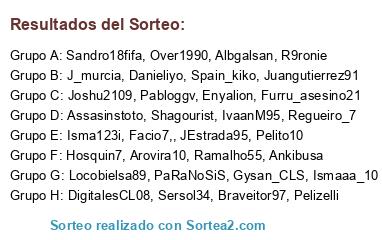 Lista de participantes: Juangutierrez91, Assasinstoto, Over1990, IvaanM95, Danieliyo, JEstrada95, PaRaNoSiS, Isma123i, Gysan_CLS, Ismaaa_10, Pabloggv, DigitalesCL08, Regueiro_7, J_murcia, Ramalho55, Facio7,, Joshu2109, Sandro18fifa, Braveitor97, Hosquin7, Pelito10, Pelizelli, Albgalsan, Ankibusa, Locobielsa89, Enyalion, Spain_kiko, R9ronie, Arovira10, Shagourist, Sersol34, Furru_asesino21.