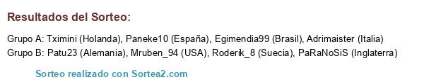 Lista de participantes: Roderik_8 (Suecia), Patu23 (Alemania), PaRaNoSiS (Inglaterra), Paneke10 (España), Egimendia99 (Brasil), Adrimaister (Italia), Tximini (Holanda), Mruben_94 (USA).