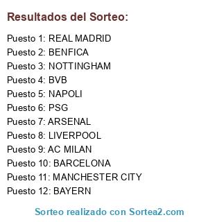 Lista de participantes: BARCELONA, BENFICA, BAYERN, LIVERPOOL, NOTTINGHAM, AC MILAN, MANCHESTER CITY, NAPOLI, ARSENAL, REAL MADRID, PSG, BVB.