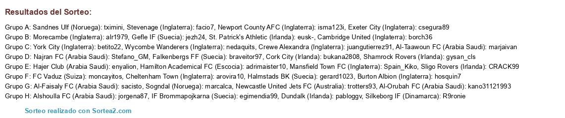 Lista de participantes: Al-Orubah FC (Arabia Saudi): kano31121993, Alshoulla FC (Arabia Saudi): jorgena87, Najran FC (Arabia Saudi): Stefano_GM, Al-Taawoun FC (Arabia Saudi): marjaivan, Sandnes Ulf (Noruega): tximini, Falkenbergs FF (Suecia): braveitor97, Gefle IF (Suecia): jezh24, Burton Albion (Inglaterra): hosquin7, York City (Inglaterra): betito22, Cambridge United (Inglaterra): borch36, Mansfield Town FC (Inglaterra): Spain_Kiko, Wycombe Wanderers (Inglaterra): nedaquits, Sogndal (Noruega): marcalca, Stevenage (Inglaterra): facio7, FC Vaduz (Suiza): moncayitos, Hamilton Academical FC (Escocia): adrimaister10, Exeter City (Inglaterra): csegura89, Crewe Alexandra (Inglaterra): juangutierrez91, Hajer Club (Arabia Saudi): enyalion, Al-Faisaly FC (Arabia Saudi): sacisto, Newport County AFC (Inglaterra): isma123i, IF Brommapojkarna (Suecia): egimendia99, Newcastle United Jets FC (Australia): trotters93, Cheltenham Town (Inglaterra): arovira10, Dundalk (Irlanda): pabloggv, Cork City (Irlanda): bukana2808, Halmstads BK (Suecia): gerard1023, Shamrock Rovers (Irlanda): gysan_cls, Silkeborg IF (Dinamarca): R9ronie, Sligo Rovers (Irlanda): CRACK99, St. Patrick's Athletic (Irlanda): eusk-, Morecambe (Inglaterra): alr1979.