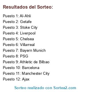 Lista de participantes: Liverpool, Al-Ahli, Manchester City, Bayern Munich, Barcelona, PSG, Getafe, Chelsea, Villarreal, Stoke City, Athletic de Bilbao, Ajax.