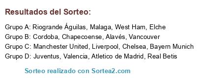 Lista de participantes: Chapecoense, Manchester United, Elche, Chelsea, Vancouver, Riogrande Águilas, West Ham, Cordoba, Valencia, Liverpool, Real Betis, Juventus, Atletico de Madrid, Alavés, Malaga, Bayern Munich.