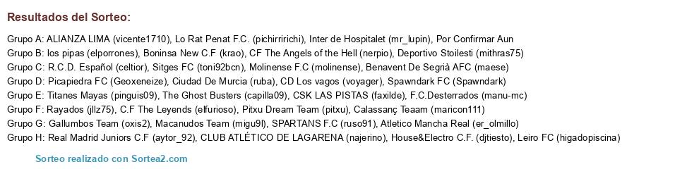 Lista de participantes: R.C.D. Español (celtior), F.C.Desterrados (manu-mc), Lo Rat Penat F.C. (pichirririchi), Boninsa New C.F (krao), Titanes Mayas (pinguis09), The Ghost Busters (capilla09), Rayados (jllz75), Benavent De Segrià AFC (maese), Sitges FC (toni92bcn), Gallumbos Team (oxis2), CLUB ATLÉTICO DE LAGARENA (najerino), Macanudos Team (migu9l), Spawndark FC (Spawndark), House&Electro C.F. (djtiesto), Picapiedra FC (Geoxeneize), Atletico Mancha Real (er_olmillo), CD Los vagos (voyager), Molinense F.C (molinense), Real Madrid Juniors C.F (aytor_92), Deportivo Stoilesti (mithras75), los pipas (elporrones), CSK LAS PISTAS (faxilde), C.F The Leyends (elfurioso), Inter de Hospitalet (mr_lupin), CF The Angels of the Hell (nerpio), SPARTANS F.C (ruso91), ALIANZA LIMA (vicente1710), Ciudad De Murcia (ruba), Leiro FC (higadopiscina), Calassanç Teaam (maricon111), Pitxu Dream Team (pitxu), Por Confirmar Aun.