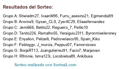 Lista de participantes: Marjaivan, Isma123i, Byronmixeleroney, Tanito226, Regueiro_7, Famorvizoso, Eliaasfernandez, Pabloggv, Ankibusa, Pedrovelasco95, R9ronie, Zysr4C29, Furru_asesino21, Spain_Kiko, J_murcia, Stiwiedm27, Pelito10, Juangutierrez91, Gysan_CLS, Yeraiguiu2311, Enyalion, Pelizelli, IvaanM95, Arovira9, Facio7, Egimendia99, BorjaRT13, Betito22, Ramalho55, Locobielsa89, Jemi666, Peppuz07.