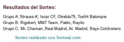 Lista de participantes: Iscar CF, Tosfrit Balompie, Real Madrid, Pablo, At. Madrid, Rayito, Rayo Colchonero, Otrebla79, Rigobert, MM7 Team, Mr. Chaman, Strauss-K.