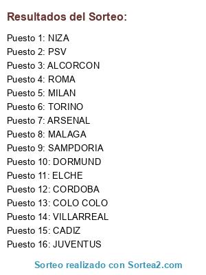 Lista de participantes: NIZA, JUVENTUS, ROMA, CORDOBA, ELCHE, ARSENAL, CADIZ, MALAGA, TORINO, VILLARREAL, PSV, DORMUND, ALCORCON, COLO COLO, MILAN, SAMPDORIA.
