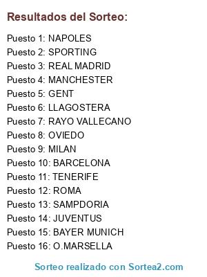 Lista de participantes: NAPOLES, LLAGOSTERA, JUVENTUS, BARCELONA, TENERIFE, ROMA, MANCHESTER, O.MARSELLA, RAYO VALLECANO, OVIEDO, SPORTING, BAYER MUNICH, GENT, SAMPDORIA, REAL MADRID, MILAN.