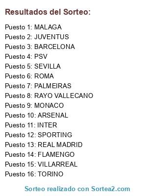 Lista de participantes: MALAGA, ROMA, SPORTING, VILLARREAL, PALMEIRAS, PSV, RAYO VALLECANO, ARSENAL, TORINO, FLAMENGO, JUVENTUS, INTER, BARCELONA, REAL MADRID, SEVILLA, MONACO.
