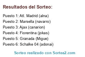 Lista de participantes: Marsella (navarro), Schalke 04 (adonai), Atl. Madrid (alna), Ajax (canarion), Granada (Migue), Fiorentina (jokas).