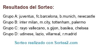Lista de participantes: fc.barcelona, tottenham, r.madrid, newcastle, lazio, inter milan, chelsea, palermo, m.city, s.gijon, udinese, basilea, villarreal, juventus, b.munich, rayo vallecano.