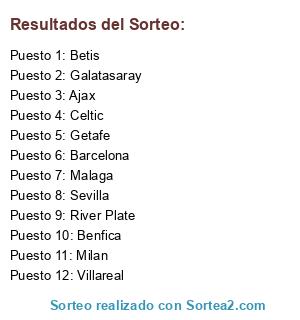 Lista de participantes: Ajax, Benfica, Villareal, Getafe, Celtic, Betis, Milan, Barcelona, Sevilla, River Plate, Galatasaray, Malaga.