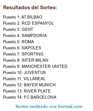 Lista de participantes: SPORTING, SAMPDORIA, ROMA, NAPOLES, VILLAREAL, MANCHESTER UNITED, BAYER MUNICH, FC BARCELONA, RIVER PLATE, RCD ESPANYOL, INTER MILAN, JUVENTUS, GENT, AT.BILBAO.