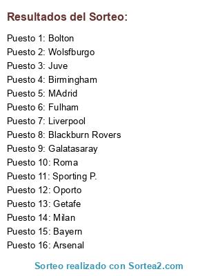 Lista de participantes: MAdrid, Milan, Bayern, Juve, Oporto, Arsenal, Roma, Liverpool, Birmingham, Fulham, Getafe, Bolton, Wolsfburgo, Galatasaray, Sporting P., Blackburn Rovers.