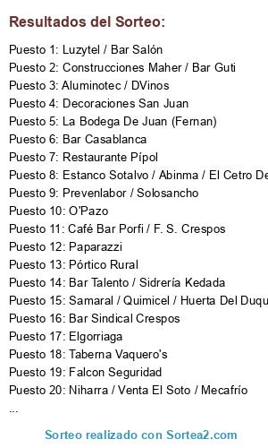 Lista de participantes: Taberna Vaquero's, Tornadizos de Ávila / Deportes Alfonso El Patio, Bar Talento / Sidrería Kedada, Prevenlabor / Solosancho, Bar Sindical Crespos, Restaurante Sanjuaniego / Don Chuletón, Samaral / Quimicel / Huerta Del Duque / Agustina, Oh! Publicidad / Restaurante Rivilla, Restaurante Pípol, Paparazzi, O'Pazo, Niharra / Venta El Soto / Mecafrío, La Mezquita 25º Aniversario, Construcciones Maher / Bar Guti, Luzytel / Bar Salón, Kia Elanmotor, Falcon Seguridad, Camping Los Talleres / Énfasis / Unión, Decoraciones San Juan, Café Bar Porfi / F. S. Crespos, Bar Casablanca, Carseva / Avícola Sánchez / El Riko Pollo, Axa Seguros / Ávila-Rural.com, Aluminotec / DVinos, Estanco Sotalvo / Abinma / El Cetro De Ottokar, La Bodega De Juan (Fernan), Pórtico Rural, Elgorriaga.