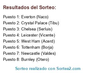 Lista de participantes: Everton - Naco, Leicester - Vag, Arsenal - Borja, Liverpool - Manu, Burnley - Otero, Crystal Palace - Tibu, Newcastle - Valdes, West Ham - Acerd.