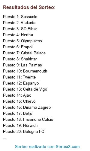 Lista de participantes: Twente, Ajax, Leicester, Norwich, Betis, Atalanta, Southamptom, Shakhtar, Dinamo Kiev, Chievo, Olympiacos, Dinamo Zagreb, Hertha, Empoli, SD Eibar, Udinese, Bologna FC, Espanyol, FC Koln, Sassuolo, Hannover 96, Celta de Vigo, Frosinone Calcio, Torino FC, Wender Bremen, Cristal Palace.