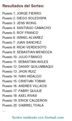 Lista de participantes: ALEX CEDEÑO, FABRY QUIJIJE, VICENTE NICOLA, JAVIER SOLEDISPA, IVAN HIDALGO, RICKI VERDESOTO, ISRAEL ALVAREZ, SEBASTIAN AVILES, CRISTIAN TOBAR, CARLOS CACERES, ARIEL TAPIA, MATIAS UREÑA, JENS WONG, DANNY QUILUMBAQUI, DIEGO SOLEDISPA, GABRIEL TOALA, SANTIAGO CAMACHO, ROY FRANCO, JORGE FIERRO, ALEX CORTAZAR, ERICK CALDERON, CARLOS ARANA, JULIO FRANCO, AXEL RIVAS, JUAN SANCHEZ, JOSUE ROMAN, ANDRES VILLACIS, JUAN PONCE, ALLAN SUAREZ, JEREMY MOLINA, JHON RUIZ, SEBASTIAN MENDOZA.