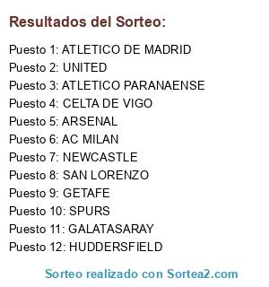 Lista de participantes: ATLETICO PARANAENSE, GALATASARAY, NEWCASTLE, GETAFE, AC MILAN, SPURS, UNITED, ATLETICO DE MADRID, CELTA DE VIGO, ARSENAL, HUDDERSFIELD, SAN LORENZO.