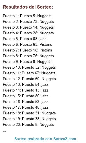 Lista de participantes: Puesto 1: Pistons, Puesto 2: Pistons, Puesto 3: Nuggets, Puesto 4: Nuggets, Puesto 5: Nuggets, Puesto 6: Nuggets, Puesto 7: jazz, Puesto 8: Nuggets, Puesto 9: Nuggets, Puesto 10: Nuggets, Puesto 11: Pistons, Puesto 12: Nuggets, Puesto 13: jazz, Puesto 14: Nuggets, Puesto 15: Nuggets, Puesto 16: Pistons, Puesto 17: Nuggets, Puesto 18: Pistons, Puesto 19: Nuggets, Puesto 20: Nuggets, Puesto 21: Nuggets, Puesto 22: jazz, Puesto 23: Nuggets, Puesto 24: Nuggets, Puesto 25: Nuggets, Puesto 26: Nuggets, Puesto 27: Pistons, Puesto 28: Nuggets, Puesto 29: Pistons, Puesto 30: Pistons, Puesto 31: Nuggets, Puesto 32: Nuggets, Puesto 33: Pistons, Puesto 34: Pistons, Puesto 35: Nuggets, Puesto 36: Nuggets, Puesto 37: Nuggets, Puesto 38: Nuggets, Puesto 39: Nuggets, Puesto 40: Nuggets, Puesto 41: jazz, Puesto 42: Nuggets, Puesto 43: Pistons, Puesto 44: Nuggets, Puesto 45: Nuggets, Puesto 46: Pistons, Puesto 47: Pistons, Puesto 48: jazz, Puesto 49: Nuggets, Puesto 50: Nuggets, Puesto 51: Nuggets, Puesto 52: Nuggets, Puesto 53: jazz, Puesto 54: jazz, Puesto 55: jazz, Puesto 56: Nuggets, Puesto 57: Nuggets, Puesto 58: Pistons, Puesto 59: Pistons, Puesto 60: Nuggets, Puesto 61: Nuggets, Puesto 62: Nuggets, Puesto 63: Pistons, Puesto 64: Nuggets, Puesto 65: Nuggets, Puesto 66: Nuggets, Puesto 67: Nuggets, Puesto 68: jazz, Puesto 69: jazz, Puesto 70: Pistons, Puesto 71: jazz, Puesto 72: Nuggets, Puesto 73: Nuggets, Puesto 74: Nuggets, Puesto 75: Nuggets, Puesto 76: Nuggets, Puesto 77: Nuggets, Puesto 78: Nuggets, Puesto 79: Nuggets, Puesto 80: jazz, Puesto 81: jazz, Puesto 82: Nuggets, Puesto 83: Pistons, Puesto 84: Nuggets.