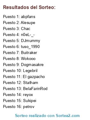 Lista de participantes: Wokooo, Chac, petrov, Alesupe, abpfans, BelaFarinRod, Dogmasakre, DJmummy, n0eL-_-, Sukipei, tuso_1990, El gazpacho, Buitraker, Legebril, Statham, reyox.