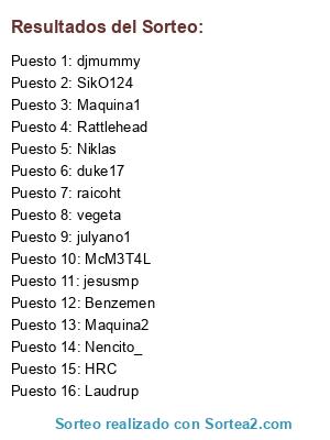 Lista de participantes: SikO124, raicoht, djmummy, duke17, Rattlehead, Laudrup, jesusmp, julyano1, Niklas, McM3T4L, Benzemen, HRC, Nencito_, vegeta, Maquina1, Maquina2.