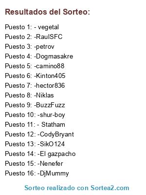 Lista de participantes: -Seemann, -petrov, -vegeta, -Camino88, -HrC, -Dogmasakre, -Kinton605746448, -Benzemen, -Cody, -Statham, -jwanes, -felipit0, -SikO124, -raicoht, -euralio, -num16.