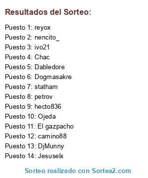 Lista de participantes: Chac, Dabledore, petrov, Dogmasakre, camino88, DjMunny, Jesuselx, Ojeda, El gazpacho, nencito_, hecto836, reyox, ivo21, statham.