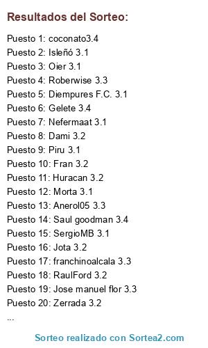 Lista de participantes: Nefermaat 3.1, Quirce24 3.2, Yban Figueroa 3.1, Zerrada 3.2, Isleñó 3.1, Fran 3.2, Anerol05 3.3, Dami 3.2, Gelete 3.4, javi p. 3.2, SergioMB 3.1, Morta 3.1, Saul goodman 3.4, Oier 3.1, Rincon 3.4 49, franchinoalcala 3.3, Jomicheque 3.2, Antonio Valladares 3.3, DABAMU 3.4, Jota 3.2, Roberwise 3.3, Danimador 3.3, Jose manuel flor 3.3, RaulFord 3.2, Piru 3.1, Diempures F.C. 3.1, Jose Maria 3.3, coconato3.4, Luka Trunks 3.1, Ayabalo88 3.3, Huracan 3.2, Alberto Muñiz 3.4 VS Pardeza 3.3.