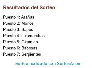 Lista de participantes: Sapos, Serpientes, Monos, Gigantes, Arañas, Babosas, salamandras.