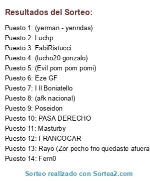 Lista de participantes: FabiRistucci, I ll Boniatello, FRANCOCAR, Masturby, Poseidon, Luchp, Eze GF, Rayo (Zor pecho frio quedaste afuera), Fern0, (yerman - yenndas), (Evil pom pom pomi), (afk nacional), (lucho20 gonzalo), PASA DERECHO.