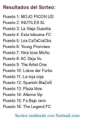 Lista de participantes: MOJO PICON UD, The Artist One, INUTILES SL, Fs Bajo cero, Spanish BlaZeS, Nice tooo Michu, Los CaTaCraCks, La roja coja, The Legend FC, Esta tobuena FC, AC Deja Vu, La Vieja Guardia, Young Promises, Lokos der Furbo, Alterne Vip, Plaza libre.