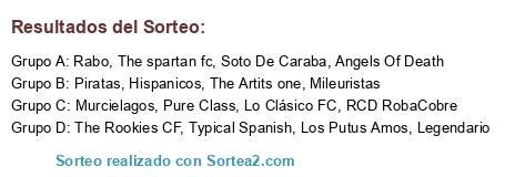 Lista de participantes: Murcielagos, Pure Class, Hispanicos, The Artits one, Legendario, Los Putus Amos, Typical Spanish, The Rookies CF, Angels Of Death, RCD RobaCobre, Piratas, Lo Clásico FC, Mileuristas, The spartan fc, Rabo, Soto De Caraba.