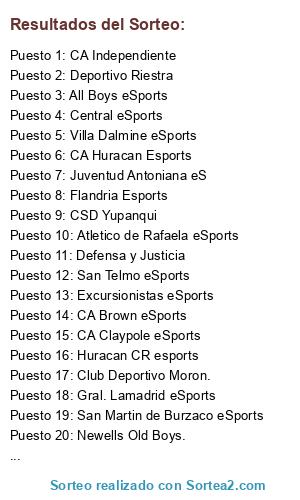 Lista de participantes: AAAJ eSports, Union eSports, Talleres, Flandria Esports, Club Deportivo Moron., San Martin de Burzaco eSports, Atletico de Rafaela eSports, CSD Yupanqui, Villa Dalmine eSports, Estudiantes BA, Huracan CR esports, CA Claypole eSports, Nueva Chicago eSports, Excursionistas eSports, Cambaceres, Comunicaciones eSports., San Telmo eSports, Sarmiento, Sacachispas FC, Deportivo Riestra, Atlanta eSport, Defensa y Justicia, Newells Old Boys., Guillermo Brown eSports, All Boys eSports, Juventud Antoniana eS, CA Huracan Esports, CA Brown eSports, Quilmes A.C, Gral. Lamadrid eSports, CA Independiente, Central eSports.
