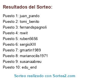 Lista de participantes: rswit , tomi_benito , susanaabreu , marianocilis1971 , gmartin1989 , edu_end , ruben5656 , sergioXIII , juan_pando , fernandspagnoli.