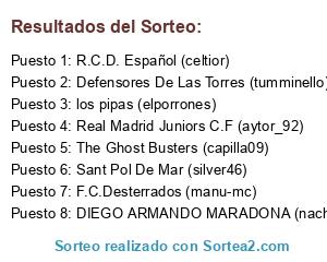 Lista de participantes: Sant Pol De Mar (silver46), DIEGO ARMANDO MARADONA (nachotummi), los pipas (elporrones), The Ghost Busters (capilla09), Defensores De Las Torres (tumminello), R.C.D. Español (celtior), Real Madrid Juniors C.F (aytor_92), F.C.Desterrados (manu-mc).