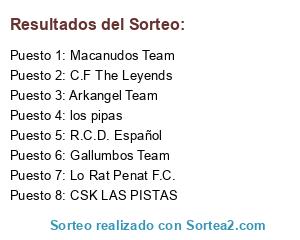 Lista de participantes: Lo Rat Penat F.C., Arkangel Team, los pipas, Gallumbos Team, CSK LAS PISTAS, R.C.D. Español, C.F The Leyends, Macanudos Team.