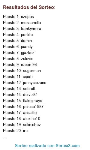 Lista de participantes: hybrid, mescamilla, deiviz81, ruben-94, kortako, selinichev, perdy_trs, peluco1987, iru, flakojmays, lakylu, zequi, domin, assalito, cipotti, sefirottt, cholakas, jas73, juandy, davidiho10, alexiho10, jonnyciezano, zulovic, rizopas, poletinho10, jgazkez, trammel, frankymora, richisanfer, sugerman, portillo, rivaltales.