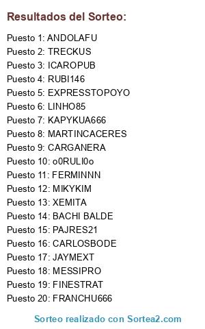Lista de participantes: FERMINNN, SELEEEEE, CARLOSBODE10, LINHO85, SENZU14, BRENES29, PAKIU, FRANLU, JAIMEXT, XEMITA17, LIBANO ROJO, BERMEE, PLAYERJULIOH, MATUJK, SINPLOMO98, KIMANY19.