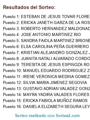 Lista de participantes: ERICKA FABIOLA MUÑOZ RAMOS(1), TERESITA DE JESUS ESPINOZA RODRIGUEZ(1), ROBERTO HERNANDEZ MALDONADO(1), KRISTIAN ALEJANDRO GONZALEZ JUAREZ(1), JOSE ANTONIO MARTINEZ RIO(1), SANDRA FAIOLA MARTINEZ BRIONES(1), ELSA CAROLINA PEÑA GUERRERO(1), IRENE VERONICA MEDINA GOMEZ(1), MANUEL EDUARDO RODRIGUEZ ZAMORA(1), MAYRA YADIRA VALADES FLORES(1), SILVIA MARIA JIMENEZ SEGOVIA(1), DANIELA ELIZABETH SEGURA LEYVA(1), ERICKA JANETH GARZA DE LA ROSA(1), JUANITA NATALI ALVARADO CORDOVA(1), GUSTAVO ADRIAN VALADEZ GONZALEZ(1), ESTEBAN DE JESUS TOVAR FLORES(1).