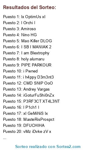 Lista de participantes: Adri4n xX, aeRophoN StarK, affliction rb, Ah SnipeSlayeR, AlexanderxLT, Amiroso, Anarchy RulezZ, Andrey Vargas, Anibalz, cado01, CB Lasky, CMD SNIP OoO, cR CarrieL, DARK VINKE KW, Demonic Snipec, DFUCHIHA, druge saga, B3N3D1CT0, DuV4n117, elkincely87, Erny McCain, Evyl Link, EvZ Niu Nui l, Faberao, NIKHO LF, Froy da Gun, FsK LiaN xI, FsK PoCho xI, Ft xOroCh1 I, Goten Dell ta, Gz xlDestroyIx, holy alumaru, I am Blextrophy, i Dark Caos i, I David knot I, i h4ppy D3m3nt3, i maniaack i, I Nissac I, i p o r r a s i, i Pwned, i SB i M4NI4K, I SB I MANIAK 2, I SilverHawk xx, I2xiiKou, IDaRkI Chikoo I, IDaRkI DelTTa I, IDaRkI RsC I, iGhoStkiLLa, iGotUrBrutality, iGoturFuShi0nZx, iGotUrPeguiola, igoturpeluola, iix apache xii, iJuxnito vS, iTz JoHAn RcH, JdRo623, jhonmo mgs, l ases1no l, L DAN 8, l MiroKu l, l Orchi l, l P1ch1 l, lAzT KillCropSx, legerous, LETHALLAKIRA, LL CathaL LL, ll tscorpion ll, lLNYl Kayros, lLNYl Shadow, Lord Vampy, LuizIzMad, lx OptimUs xI, Mao Killer DLOG, Marlon David RQ, MaStakiLLa Jr, MasteRisProspct, mininow, mlg shakal, Nino HG, OM3GUS, OneThousanSunny, Oz Mgs, P3RF3CT XT4L3NT, PIPE PARKOUR, Pointdd 1, Rpj supermakiaa, Rudy Motion, Rxmb0, S DxrkBlay K, S FoR bardack x, S FoR xDeLt4x, SK Qkuality, SNIPEPROFESSOR, SPAwNY v2, SpT Silver lGl, T3RR1ble nStuff, tf best anark14, TrueSlays, TutoredTarsier6, TxNexTJavieR, UnG SaaDii, vMz iDvke zV x, WATZAMARA, WsK TeaM Magic, WzD xBaMBinO, x ka1s3r, x racs0 x, xi ney ixv5, xl GeMiNiS lx, Xx NaRuTo25 xX, xxBlUsTeR117XX, xxcambx40xx, XxJim Morrisonx, Xxl G4T0 lxX, xXSgt MAXIMUSXx, Yashiir0 z, The Biological, ZaTaeL, Zero Cool Pro, ZneiderAk47, ZP CAMO, Xxale3xX KILLER.