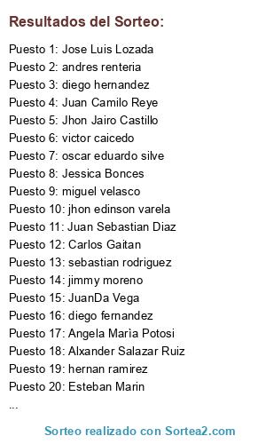 Lista de participantes: Miguel Angel Lugo, Carlos Gaitan, Oscar Arias, Alxander Salazar Ruiz, Jhon Jairo Castillo, Angela Marìa Potosi, Esteban Marin, Jessica Bonces, Juan Camilo Reye, Jose Luis Lozada, Liceth Lopez, Nicolas Isaza Gonzales, JuanDa Vega, David Quiñonez, andres renteria, andres felipe muñoz, GINA , jimmy moreno, alejandro benitez, cristian, miguel velasco, sebastian rodriguez, Sergio Morales, Jaiver Rodriguez, Juan Sebastian Diaz, Pablo absalon cuero toro, diego hernandez, jemen camacho , jhon edinson varela, hernan ramirez, oscar eduardo silve, victor caicedo, manuel alejandro romero, diego fernandez, pablo collazos, .