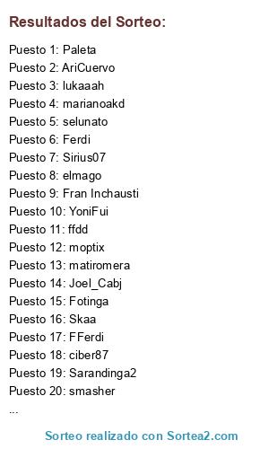 Lista de participantes: leoarroyo10, manodel10, Sirius07, ciber87, RichardCardo, Lion_arg10, lukaaah, fedex_742, Slixs, fakupili, Checho, LyckaARG, fabiandrums, Treehouse, Fotinga, FFerdi, AriCuervo, Sarandinga2, sennedjem, ffdd, El Kai, Luke_Cabj, Ferdi, emabianchi, AlesT, Shk33, nhakariin, Mardanis, cheloco_016, marianoakd, miraballes, nicko_emma, Joel_Cabj, Cavegol, CuervoGNR, Paleta, moptix, matiromera, F32CH4, RtN-RBartowskii, soake, Cachi, elmago, Kam, fede14vl, Rescate, Dickeck, YoniFui, Arty, sibecas, Drulipop, Skaa, MatiEL22, elmasa_24, JoelXeneize, LeoArL, UkViNCe, smasher, fabote, iver03, selunato, Zwolff, Fran Inchausti.