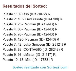 Lista de participantes: 1- GoMmO64 R, 2- Snack (ID=13220) R, 3- Superbkn98 (ID=20614) R, 4- León (ID=25996) R, 5- Patri (ID=23262) R, 6- Deadmouse (ID=12433) R, 8- Seba (ID=20023) R, 9- Lass (ID=21072) R, 11- Geovanni (ID=20173) R, 13- Bewer (ID=17654) R, 15- Miki (ID=17583) R, 23- Pacman (ID=12443) R, 24- INK-HEART (ID=24082) R, 25- kicker (ID=21355) R, 27- Freezer (ID=28265) R, 28- zack (ID=29092) R, 32- JackSkeleton (ID=22561) R, 34- Ganjo (ID=37) R, 36- eMister (ID=21117) R, 37- :::SEXY.BOY::: (ID=21927) R, 38- mini-diegox (ID=16793) R, 42- Luke Simpson (ID=28121) R, 45- Pacman (ID=12443) R, 48- Sr Gabri (ID=27631) R, 49- Tobi. (ID=12433) R, 51- Tobi. (ID=12433) R, 52- Pacman (ID=12443) R, 54- Pacman (ID=12443) R, 59- God.Andres (ID=18691) R, 61- zerwann (ID=26658) R, 66- Pacman (ID=12443) R, 68- Pacman (ID=12443) R, 70- Chato (ID=25992) R, 72- RoXxaS! (ID=29192) R, 73- Víctor3 (ID=27359) R, 74- Yo.ooh (ID=3371) R, 75- Pacman (ID=12443) R, 76- Pacman (ID=12443) R, 83- Pacman (ID=12443) R, 84- Pacman (ID=12443) R, 85- CONTAGIO (ID=28245) R, 86- Pacman (ID=12443) R, 90- Pacman (ID=12443) R, 91- Geovanni (ID=20173) R, 93- Ukraine (ID=13291) R, 94- Lass (ID=21072) R, 95- INK-HEART (ID=24082) R, 97- .:.b3rny.:. (ID=5611) R, 103- God kakote (ID=4208) R, 105- Lukers (ID=15602) R, 106- Lass (ID=21072) R, 108- Lass (ID=21072) R, 110- Boa Hancock (ID=226) R, 111- Pacman (ID=12443) R, 113- Screw (ID=26498) R, 114- Pacman (ID=12443) R, 118- Pacman (ID=12443) R, 119- Pacman (ID=12443) R, 120- Pacman (ID=12443) R, 124- Pacman (ID=12443) R, 126- Enemy (ID=11971) R, 132- Pacman (ID=12443) R, 135- markevans44 (ID=26244) R, 137- Lûkîtâs (ID=11064) R, 140- INK-HEART (ID=24082) R, 141- ismael95 (ID=12139) R, 145- :::SEXY.BOY::: (ID=21927) R, 147- Yo.ooh (ID=3371) R, 150- er-shulako (ID=4412) R.