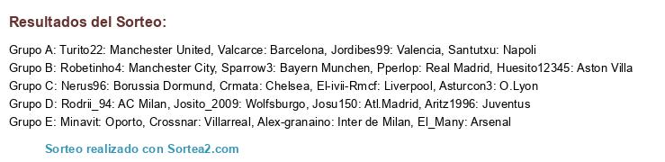 Lista de participantes: Crossnar: Villarreal, Aritz1996: Juventus, El_Many: Arsenal, Turito22: Manchester United, Santutxu: Napoli, Josu150: Atl.Madrid, Valcarce: Barcelona, Minavit: Oporto, Alex-granaino: Inter de Milan, Rodrii_94: AC Milan, Josito_2009: Wolfsburgo, El-ivii-Rmcf: Liverpool, Robetinho4: Manchester City, Jordibes99: Valencia, Huesito12345: Aston Villa, Asturcon3: O.Lyon, Sparrow3: Bayern Munchen, Crmata: Chelsea, Nerus96: Borussia Dormund, Pperlop: Real Madrid.