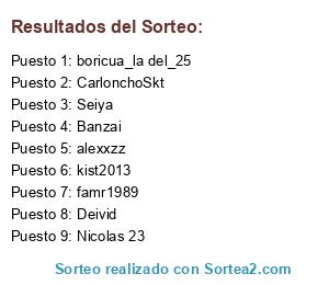 Lista de participantes: Banzai, boricua_la del_25, CarlonchoSkt, Deivid, famr1989, alexxzz, kist2013, Nicolas 23, Seiya, .