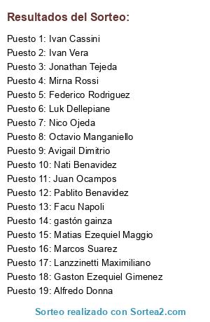 Lista de participantes: Ivan Vera, Ivan Cassini, Federico Rodriguez, Octavio Manganiello, Gaston Ezequiel Gimenez, Jonathan Tejeda, Pablito Benavidez, Facu Napoli, gastón gainza, Marcos Suarez, Matias Ezequiel Maggio, Avigail Dimitrio, Juan Ocampos, Lanzzinetti Maximiliano, Luk Dellepiane, Alfredo Donna, Nati Benavidez, Nico Ojeda, Mirna Rossi.